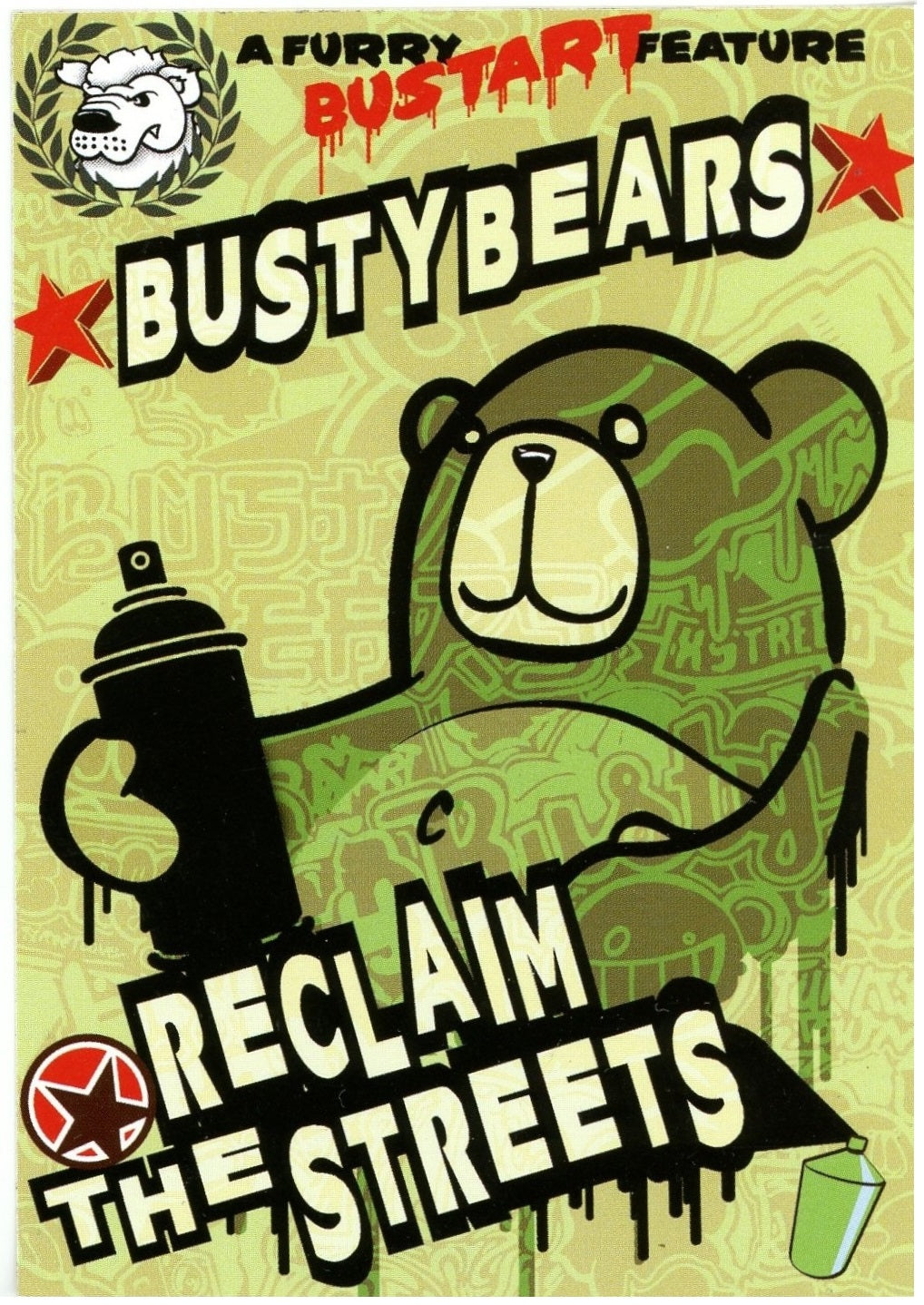 Bust Street Art / Urban Art Sticker mit Bär Character, Dose und Reclaim The Streets Message