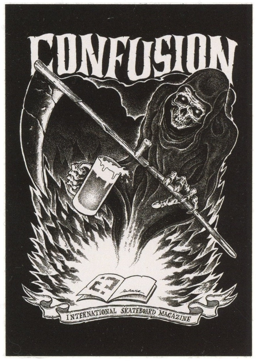 Confusion Skateboard Magazin Sticker mit Sensemann, Bier, Flammen, Heft und Schriftzug