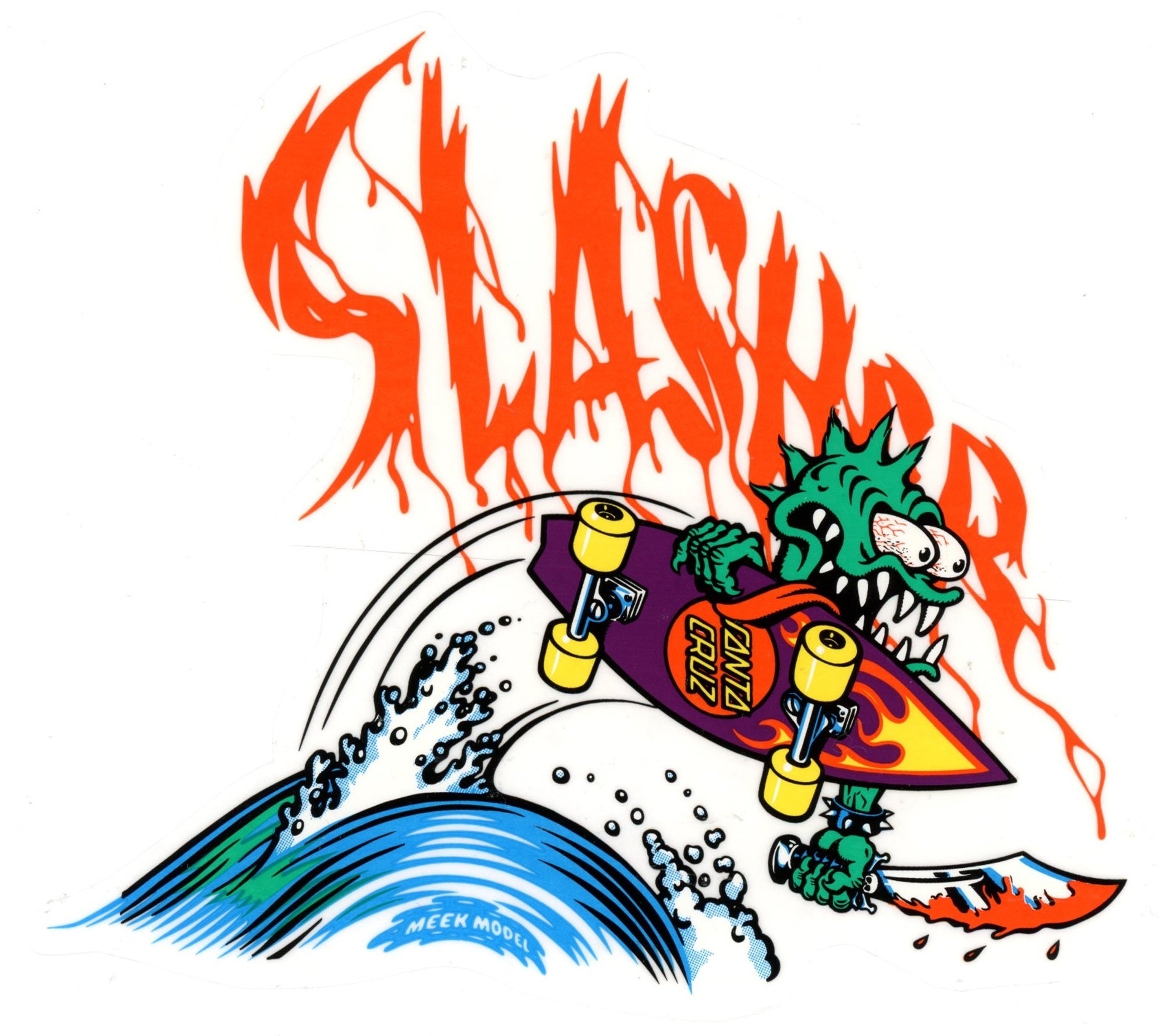 Santa Cruz Skateboard Sticker mit Slasher Monster, Schwert, Welle und Schriftzug