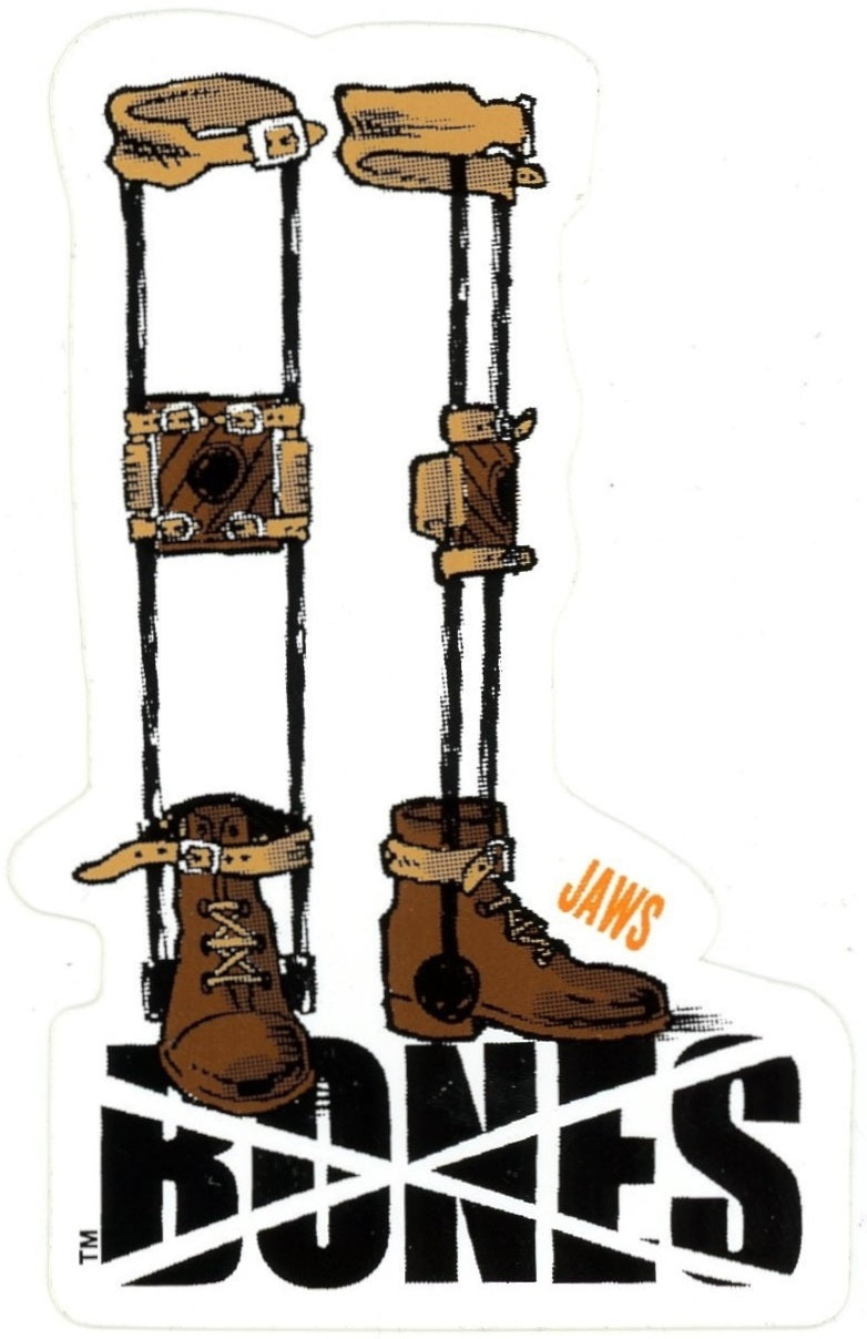 Bones Skateboard Sticker mit Schriftzug und Gehstützen. Aaron 'Jaws' Homoki Design